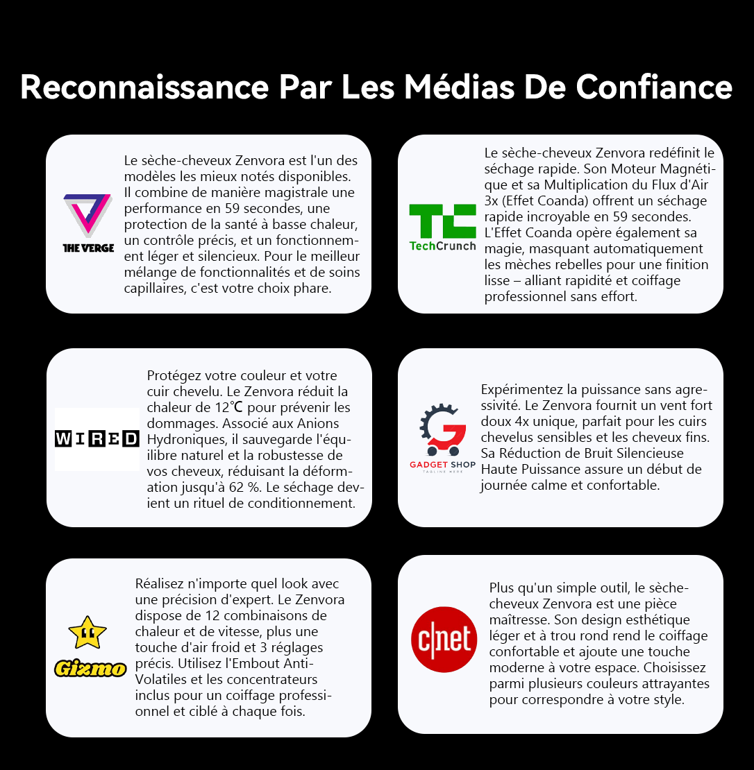 Saviez-vous que des températures élevées peuvent réduire la résilience des cheveux, les rendant plus sujets à la casse ? La technologie de séchage douce de Zenvora prévient efficacement la casse des cheveux causée par une chaleur excessive. Tout en séchant rapidement, elle aide à maintenir la force des cheveux et préserve leur structure naturelle. Faites de chaque séchage un investissement dans la santé de vos cheveux.