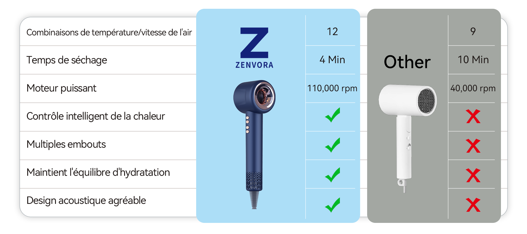Dites adieu aux simples choix "Haut, Moyen, Bas". Zenvora vous propose 12 combinaisons inédites de température de l'air et de vitesse.